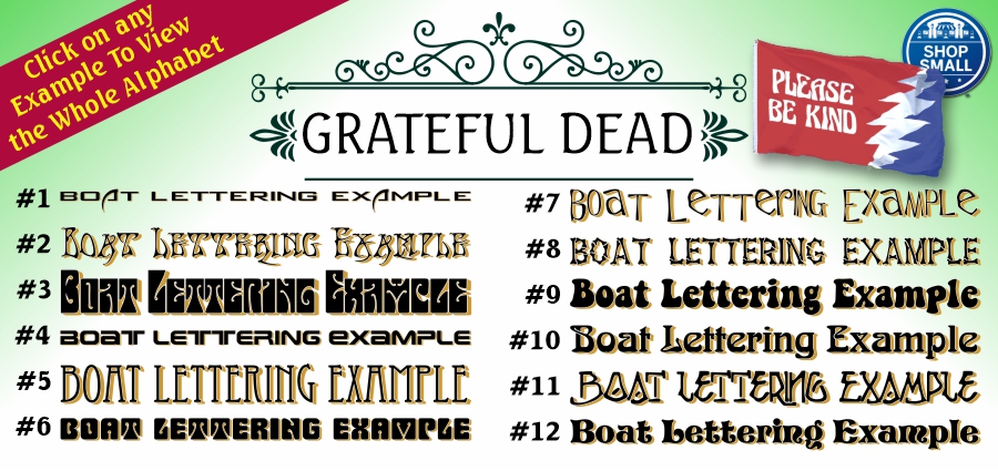 Boat Names  1. WE COME TO YOUR BOAT FOR MEASUREMENTS AND TO TAKE PHOTOS OF THE AREA WHERE THE NAME WILL GO.  Lettering below is Super-imposed over boat photo at left  2. NEXT, WE DISCUSS WHAT YOU HAD IN MIND OR WE CAN COME UP WITH A FEW DESIGN IDEAS FOR YOUR NAME.  WE PRICE OUT THE JOB AND A 50% DEPOSIT IS REQUIRED AT THIS TIME.  ONCE BACK AT OUR OFFICE WE WILL CREATE THE DESIGN AND SUPER-IMPOSE THE LETTERS AND GRAPHICS ONTO YOUR BOAT PHOTO AND EMAIL IT TO YOU FOR APPROVAL.  This photo of the boat was taken after the Lettering was installed  3. UPON APPROVAL OF THE FINAL DESIGN, WE WILL CUT AND PREP THE VINYL FOR INSTALLATION.  UNLESS YOUR PRESENCE IS DEMANDED BY THE MARINA OR CLUB WHERE YOU MOOR YOUR BOAT, WE USUALLY INSTALL YOUR LETTERING WITHIN THE NEXT 48 HRS, DEPENDENT ON WEATHER.  VINYL - We use an Industry Standard Vinyl material, which is Custom Cut into the Letters and Shapes you request.  The material has a 6 year half life which, under normal circumstances means it should look as good 6 years from now as it does today.  While there are 68 colors to choose from, We concentrate on a dozen or so main colors including, Black, White, Silver, Gold, Red, (6 variations of) Blue, Green, Yellow and Purple.  Since the Vinyl comes in one color per roll, additional colors are layered on top of one another.  We can not fade a color.  Fading happens when a White Vinyl is sprayed with Color.  While we do have the resoiurces to obtain this material, the half life is normally only 6 - 8 Months.  INSTALLATION - We can install lettering and graphics on any flat surface of your Boat.  Hull, Stern, Windows, Electric Boxes or attached Panels.  Installation charges vary with the size of the area and number of layers.  Boats with “Star board” plastics: (Usually a door that is rough to the feel and was designed to control mold growth) While it is possible to letter onto the Star Board piece, We DO NOT guarantee that the lettering will STAY glued to the area.  We are not responsible for your lettering or graphics peeling or sliding off this area.  Documented Boats - A Documented boat is registered under the Name of the Boat instead of by Registration Numbers: ex: NY #### AB. New York State requires that ALL Documented Boats/Yachts display the name on the Stern, as well as on the Port and Starboard sides of the Boat/Yacht.  A Port is also required on the Stern.  NO LETTERING CAN BE LESS THAN 4” TALL.  If you don’t have the room on your Documented Boat for the name, you MUST PRODUCE a Panel for the letters to display on properly.  SPECIAL - Ask about having your Documented Name engraved on Plastic and Mounted onto your Boat.  Old Name Removal - Vinyl - This is a 3 Step Process:  1. Heating and peeling the old name off your boat.  2. Removal of any additional Adhesives.  3. Prepping the entire area with Acetone.  NOTE: Depending on the age of your Boat, there is always fading that takes place and the old name may leave a darkened area or flat wax area after removal.  Unless you plan on repainting your boat, there’s nothing we can do about this other than create a large background area to hide it.  Most New Names will cover the old area enough not to notice.   . . . . . . . . . . . . . . . . . . . . . . . . . Cost for Removal starts at $200.00  Old Name Removal - Paint - This is a 6 Step Process: 1. Spraying Chemicals on the Paint  2. Scrubbing the area, scratching only the Painted surface, not the Hull  3. Removal of the Chemical from the Stern and placed into NYS approved trash receptacle  4. Repeat 1 - 3 as many times as needed  5. Dispose of Chemical soaked items to appropriate refuse area.  6. Prepping the entire boat area with Acetone  NOTE: Same scenario for older Boats         . . . . . . . . . . . Cost for Removal starts at $250.00  CLICK HERE FOR RECENT EXAMPLES OF OUR LETTERING   STYLE OF LETTERS  This is a list of our Most Requested Letter Styles.  Remember, Script lettering is like one long letter. Don't Order a long name for a short door.  All Script Lettering are Upper & Lower Case Only  We have over 1000 typestyles available.  For Custom Lettering not found in our list, Some lettering may invoke Additional Charges #1: Painted Script #2: Brush Script #3: French Script #4: Brooded Script #5: Sport Script #6: Union Block #7: Handle Block #8: Flue Block #9: Dom Block #10: Bratnic Block #11: The Next 5 Styles shown 2 Color w/Outline  Balloon Block #12: Amtype Serif #13: Plant-B Serif #14: Crillee Serif #15: Fancy Serif #16: The Next 5 Styles are shown 2 Color w/Shadow  Jester Serif #17: Quill Serif #18: Rounded Serif #19: Serpentine Serif #20: Serif-Z  If You Would Like an Estimate On Lettering Your Boat, Download the Boat Lettering Form Below.  Fill Out All The Necessary Information and Fax It To: 631-563-9088  We’ll Email You A True Estimate, Including Installation Costs. Trouble Downloading?  Contact us at: jeffquest@aol.com  Remember - A 50% Deposit is required prior to any design of your Boat Name  Boat Dealer Requests